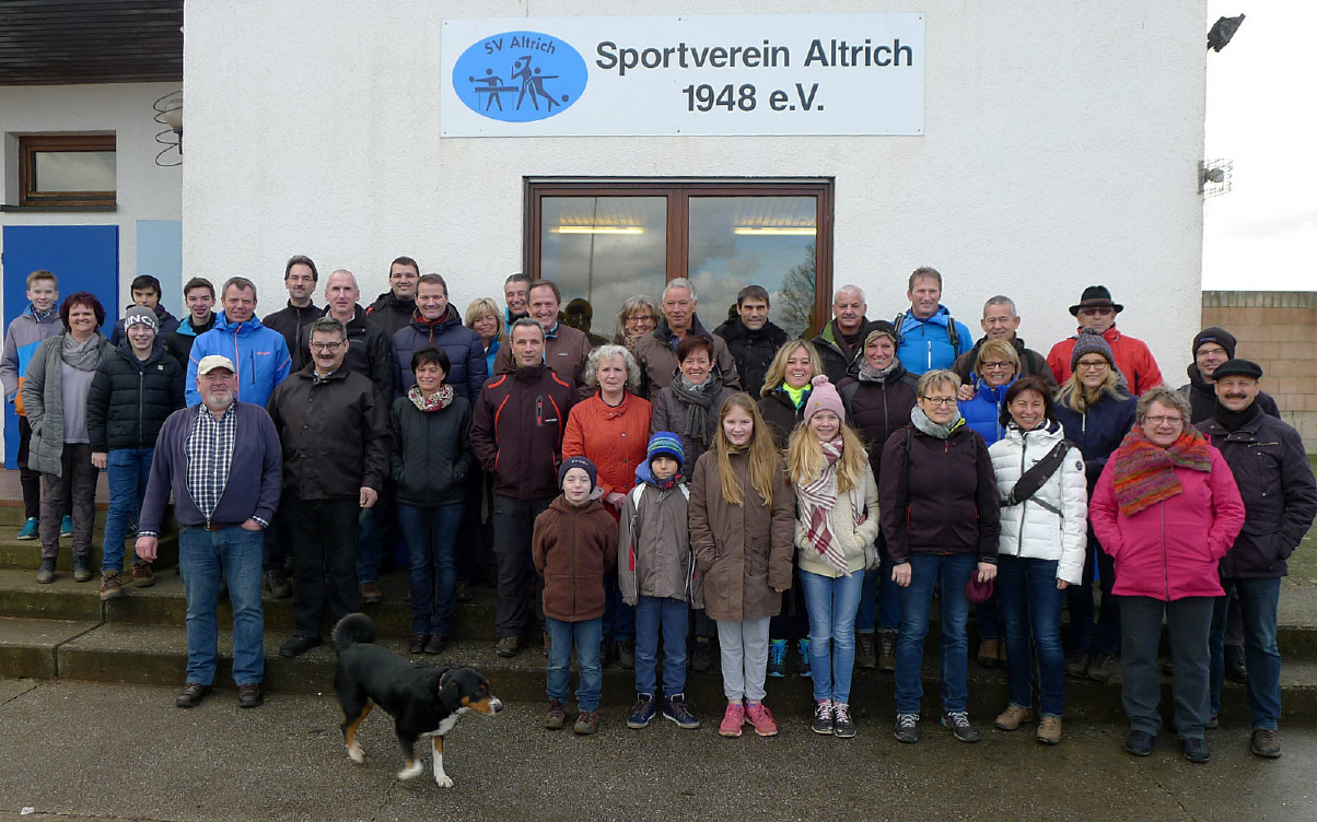 Dieses Jahr trafen sich die über 40 Teilnehmer wieder am Vereinshaus beim Sportplatz in Altrich ab 12.00 Uhr zu einem Sektempfang. Nachdem alle Wanderer sich kurz ausgetauscht, ein frohes neues Jahr 2016 gewünscht hatten und Rainer seine Begrüßung gesprochen hatte zog es uns nach draußen, denn die Sonne lachte vom Himmel – wenn auch mit kalter Luft – und wir wollten zu unserer Wanderung starten.