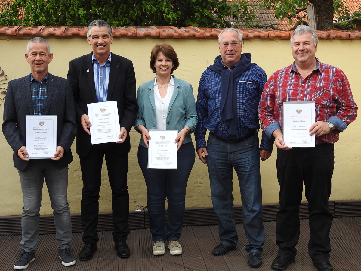 Christoph Faas wurde mit dem Ehrenbrief für 12 Jahre Vorstandsarbeit als Schriftführer ausgezeichnet. Christel Alt ist seit 18 Jahren im Vorstand tätig, zunächst als Abteilungsleiterin der Frauenturngruppe und seit 2008 als 2. Vorsitzende. Stefan Gansen arbeitet seit 24 Jahren ehrenamtlich im SV, seit 9 Jahren führt er die Kassengeschäfte. Christel Alt und Stefan Gansen erhielten für Ihre Verdienste die bronzene Ehrennadel.